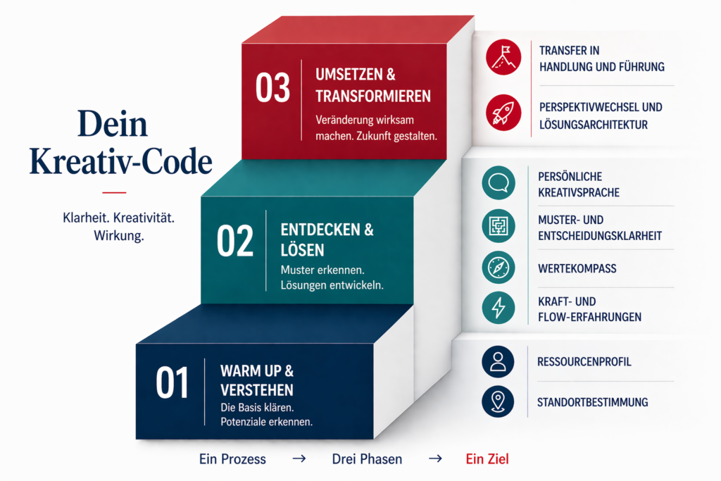 Den eigenen Kreativ-Code erkennen, kreative Ressourcen sichtbar machen und daraus klare Entscheidungen entwickeln. Für Situationen, in den Standardlösungen nicht mehr ausreichen.